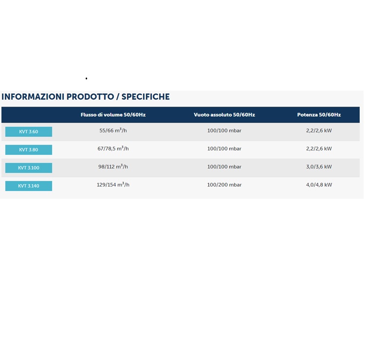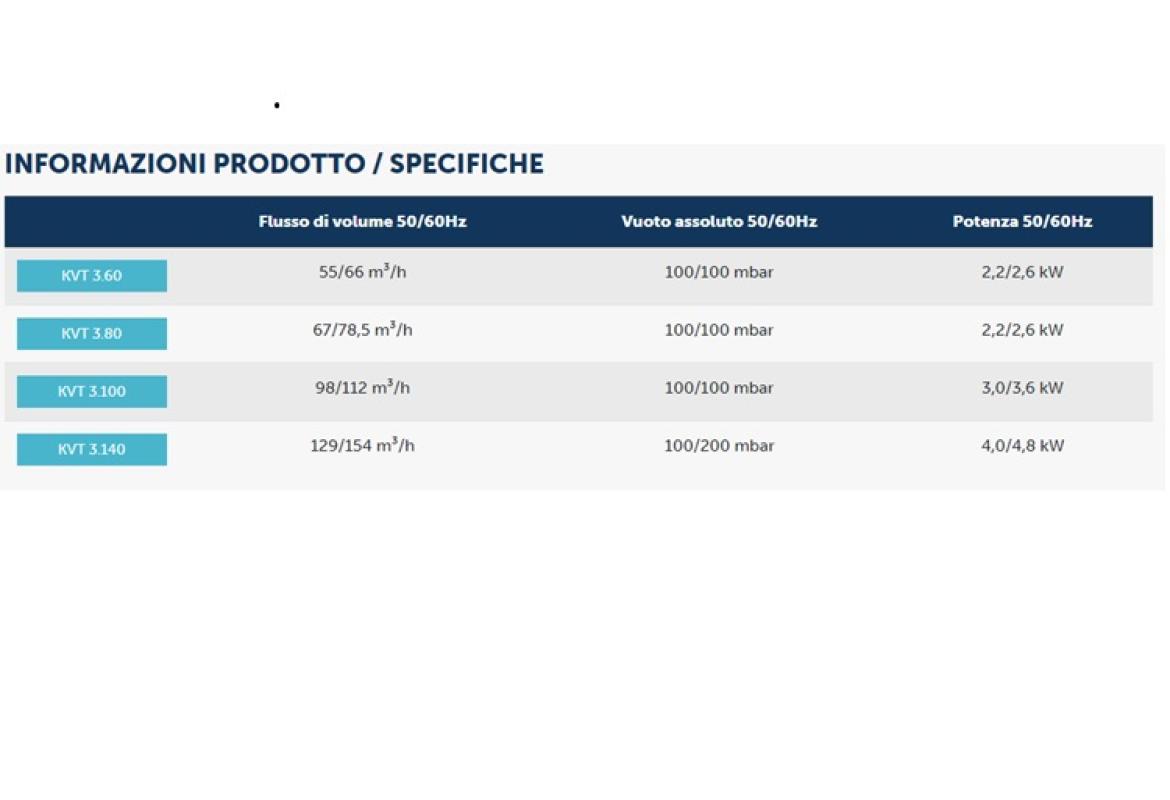 Le pompe per vuoto serie KVT sono pompe volumetriche a secco a medio vuoto e sono progettate per funzionare in servizio continuo a qualsiasi livello di vuoto fino a 100 mbar assoluti. Le pompe rotative a palette a secco della serie KVT utilizzano palette composite in grafite autolubrificanti.